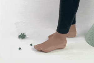 Połóż na podłodze kamyki i kubek. Palcami stóp podnieś jeden kamyk i powoli umieść go w filiżance. Powtórz to 7-8 razy na każdej stopie.