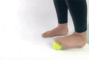 Usiądź na krześle i umieść piłkę tenisową na podłodze w pobliżu stóp. Przesuń stopę na wierzch piłki tenisowej i roluj ją wokół piłki. Używaj piłki do masażu dolnej części stopy przez 3-5 minut. Możesz zwiększyć lub zmniejszyć nacisk na piłkę tenisową w zależności od potrzeb.